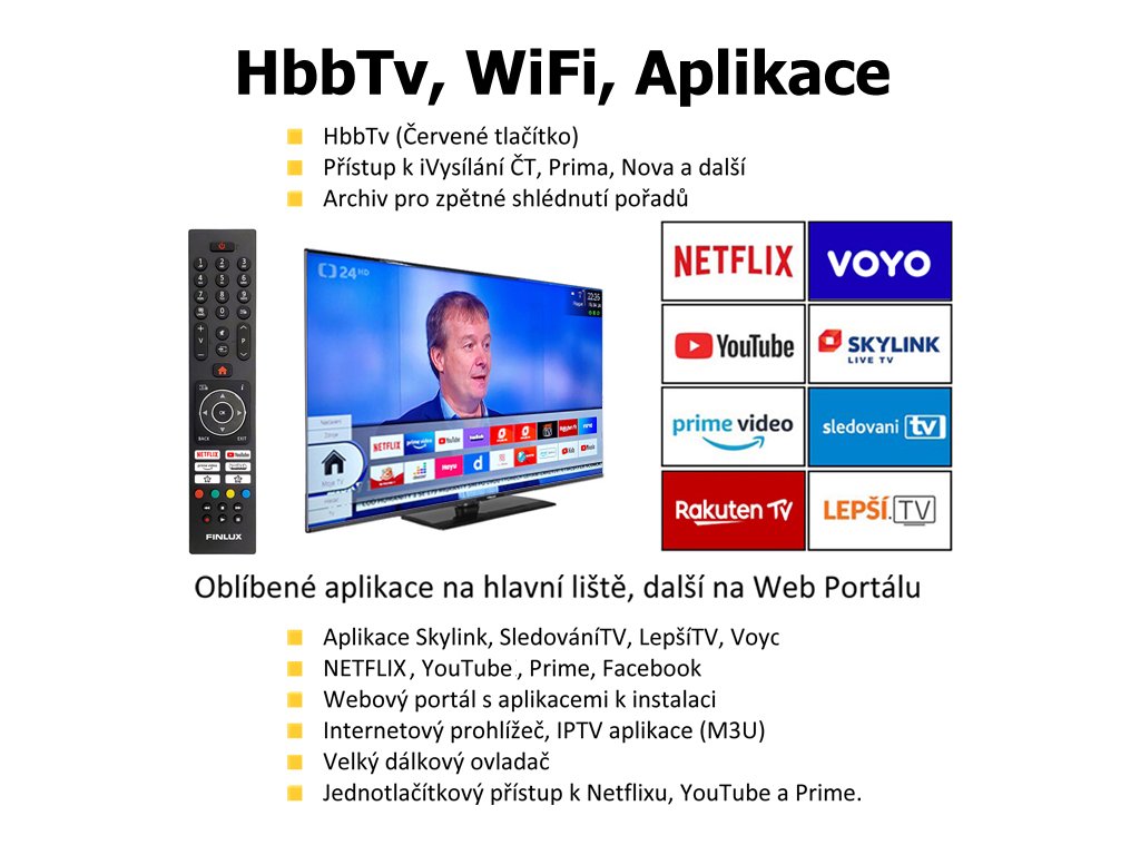 TV/VIDEO aplikace (hlavní) | Netflix 4K, YouTube 4K, Oneplay, SledováníTV, Skylink, Lepší TV, HBO Max, Disney +, PRIME, Rakuten, Canal+, Twitch, TikTok … |