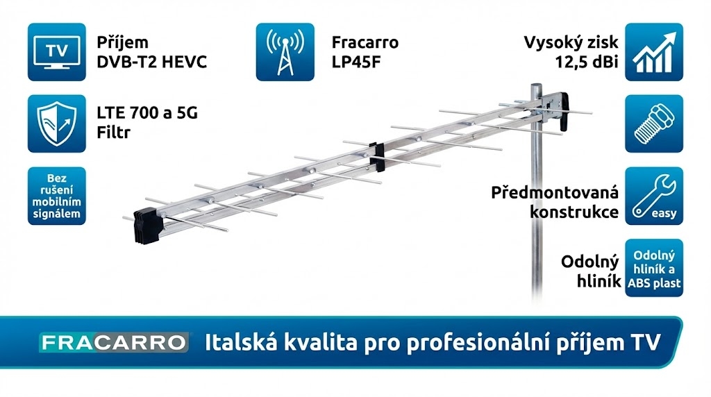Jedním z největších benefitů antény Fracarro LP45F LTE 700 je eliminace rušivých signálů v pásmech 5G a LTE, které by mohly narušit příjem televizního vysílání. Anténa je speciálně navržena tak, aby potlačila rušení nad kanálem 48, čímž zaručuje spolehlivý příjem digitálního televizního signálu.