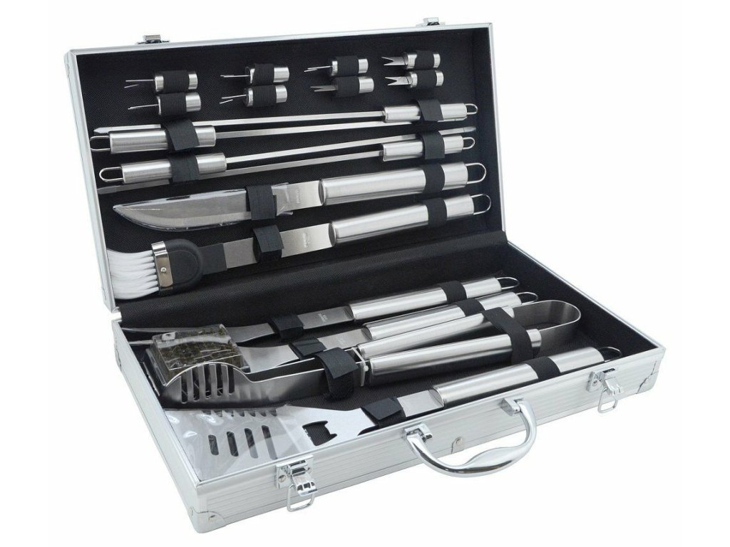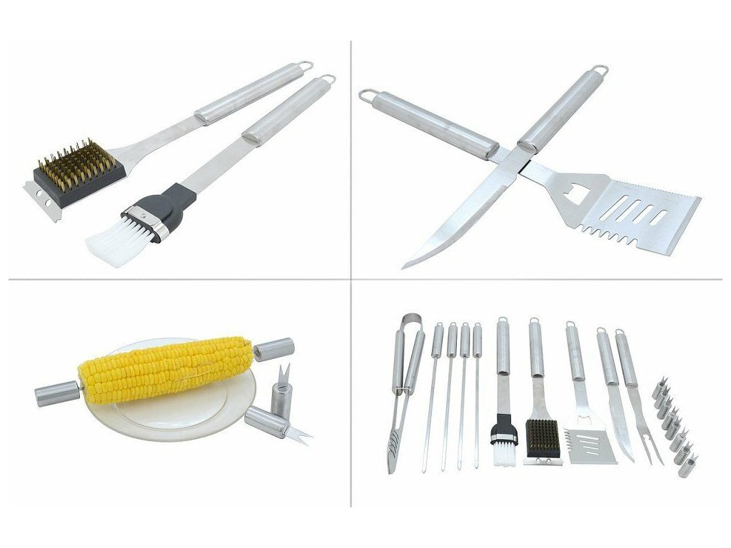 Tato profesionální sada 18ks nářadí, obsahuje vše potřebné pro správné grilování i následnou údržbu grilu.Obracečka délky 44 cm, s precizně broušenou hranou, vybavená zoubkovaným ostřím, otvírákem zátek a otvory pro odtok. Kleště, speciálně tvarované pro jistý úchop nejrůznějších pokrmů, délky 43 cm. Kartáč délky 42 cm pro údržbu grilu, kdy samotná kartáčová část z mosazi má rozměry 7 x 5,5 cm. Nepostradatelnou částí grilovcího nářadí je i dvouzubá vidlička délky 43,5 cm. Štětec délky 44 cm se 4,5 cm štětinami z nylonu, pro potírání, či mašlování pokrmů. Porcovací nůž délky 42 cm, kde ostří je délky 16 cm. 4x grilovací jehlice celkové délky 42 cm, kde na pokrmy lze využít celých 30 cm, hroty jehlic jsou broušené do špičky. Poslední součástí nářadí je 8x napichovátko délky 7 cm, určené pro držení kukuřice.