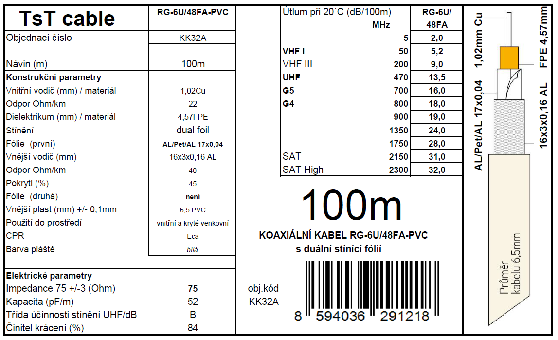 Koaxiální kabel KK32A RG-6U/48FA-PVC bílá ø6,5mm/100m