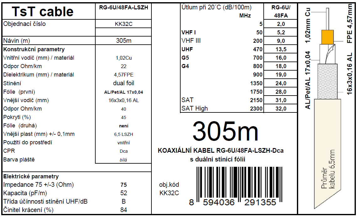 Koaxiální kabel KK32C RG-6U/48FA-LSZH-Dca bílá ø6,5mm/305m
