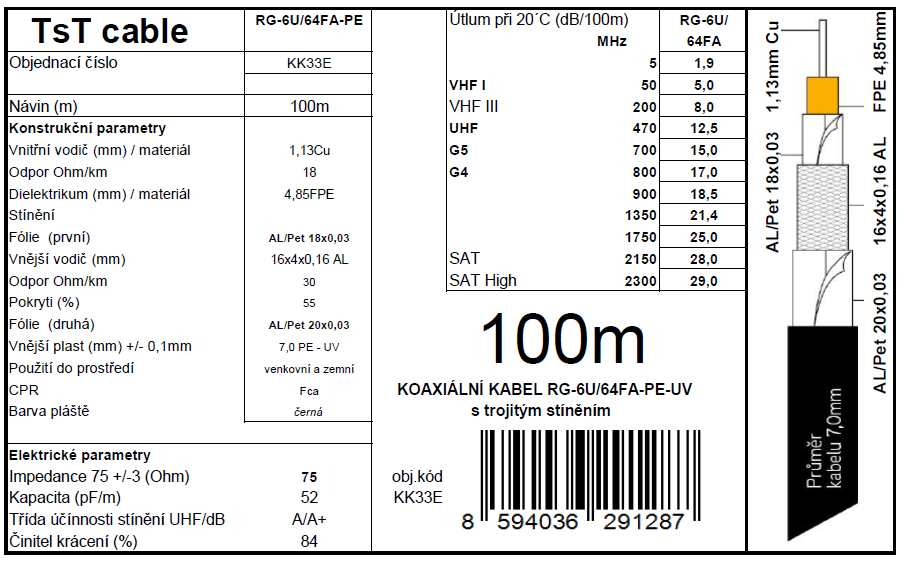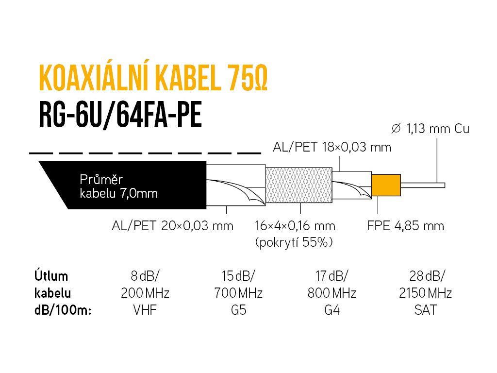 Koaxiální kabel KK33E RG-6U/64FA-PE černá ø7,0mm/100m